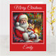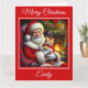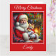 Uma bela cena de Natal com Papai Noel e um gatinho laranja adorável vestindo um vestido vermelho frito e um arco vermelho sentado ao lado de uma lareira quente e de uma árvore de Natal. Ela inclui uma mensagem de Natal engraçada original que amantes de gatos certamente amam.