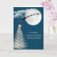Silhueta de Papais noeis no trenó com rena à luz do luar com pinheiro branco e flocos de neve.