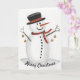 Este cartão de Natal apresenta uma pintura de aquarela original de um boneco de neve alegre num chapéu, enfeitado com ouros e esportivo de um lenço vermelho e listrado de ouro. Dentro, a saudação diz: "Desejando-lhe paz, calor e alegria no Natal e durante todo o ano. Feliz Natal!"