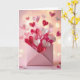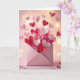 Um envelope cor-de-rosa transborda com corações em papel em vários tons de vermelho, rosa e branco, colocado sobre um fundo suavemente desfocado com luzes brilhantes. O texto pode ser alterado.