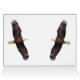 Um par de águias-carecas adultas empobrecidas numa árvore com um céu azul brilhante ao fundo.