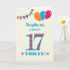 Um cartão de aniversário colorido para um sobrinho de 17 anos, O grande número 17 é preenchido com um padrão laranja, vermelho e azul, esboçado em azul brilhante. Há balões e bunting no topo, em cores coincidentes e a saudação do cobrir dianteiro é, 'Sobrinho, você tem 17 anos hoje!' em letras brilhantes vermelhas e azuis, em um fundo bolinhas amarelo e branco muito pálido, com estrelas vermelhas e laranja em cada lado da palavra 'HOJE!'. A mensagem dentro pode ser facilmente personalizada ou excluída se você desejar.