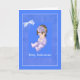 Este cartão bonito é azul médio, um bebê pequeno em roxo, que está vestindo um arco roxo em seu cabelo escuro. Há uma borda de bolinhas com um arco branco ao redor do bebê e uma borda branca fina. Obrigados a Designs por Elena para o trabalho de arte bebê.
