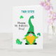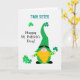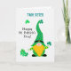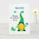 Um cartão de boas-vindas para sua irmã gêmea na Rua. Dia de Patrick, com um duende giro, segurando um shamrock. O duende tem um chapéu muito alto, em um padrão verde, uma barba grande de gengibre, um nariz enorme, capas e meias listradas e calçados pretas. No topo, em letras verdes escuras, está a palavra "TWIN SISTER" e a mensagem dentro é fácil de personalizar ou apagar.
