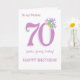 Um Cartão de Aniversário de 70 de Chic para a tua mãe com um olhar vintage. A mensagem principal do cobrir é: "Para minha mãe 70 anos de idade hoje! FELIZ ANIVERSÁRIO", Há um spray de flores perfumadas de verão, Rosa Albertine, Lavanda e Laranja Mock (Filadélfia), no topo do número '0', que se alonga com todas as letras, que está numa cor mauve de luz rosada. Por favor, sinta-se à vontade para personalizar a mensagem dentro, se quiser.