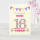 Um bonito cartão de 16 de aniversário para a sua sobrinha, com cotovelo de bolinhas, flores de primata e números cheios de padrão primata, todos num fundo de gingham amarelo pálido. A mensagem principal do cobrir é: "Para uma NIECE 16 muito especial HOJE!" A mensagem dentro é apenas uma sugestão e você pode personalizá-la facilmente ou excluí-la se preferir.