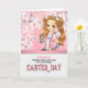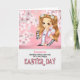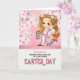 Menina doce vestida de rosa e preto para Páscoa com fundo de boque rosa macio e flor de castanha branca em branco neste cartão de Páscoa com nome de menina.