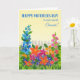 Um cartão de Dia de as mães muito bonito para o seu primo, com um leito de flor de cor brilhante, feito de uma colagem de papel pintada à mão. As flores são altas e pequenas, vermelhas, cor-de-rosa, laranja e tons de azul, com uma cerca branca de piquete atrás delas, contra um fundo amarelo ensolarado. A saudação à frente do cobrir em letras azuis profundas é "DIA DE AS MÃES FELIZ para um Primo muito especial!" A mensagem dentro é apenas uma sugestão e você pode alterá-la facilmente ou excluí-la se desejar.