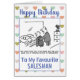 Cartoon do vendedor. O chefe diz que não pode dar um aumento de salário, mas pode oferecer um lugar para estacionamento de carro nos finais de semana. Personalize com seus próprios detalhes e mensagem. Cartão de aniversário para um vendedor ambulante.