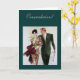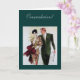Ilustração vintage de um casal muito feliz e muito elegante. Fundo verde escuro para o cartão e acima em letra cursiva verde clara "Parabéns"