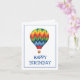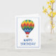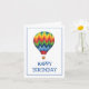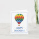 Cartão de aniversário colorido e único com ilustração de um balão de ar quente listrado com arco-íris com a mensagem "Feliz Aniversário" abaixo. Vazio no dentro.