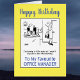 Cartão de aniversário do Office Manager. O assistente pessoal está saindo cedo porque ela não chegou tão tarde. Personalize com seus próprios detalhes e mensagem. Ideal cartão de aniversário engraçado para um gerente do escritório. Fundo amarelo.