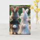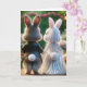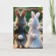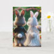 Dois coelhos vestidos de noiva e noivo ficam de mãos dadas num caminho de jardim rodeado por flores vibrantes. Todo o texto pode ser alterado.