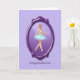 Uma jovem bailarina com um holofote nas costas bate uma bela pose contra um fundo roxo profundo. Sua fantasia é branca e amarela com trim de rosa claro. Ele faz uma placa de parabéns de excelente para uma performance recital. O texto do dentro é personalizável.