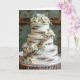 Um bolo de três camadas acentuou-se com glacé branco e texturas rústicas de madeira derivada, e enfeitado com delicadas flores brancas e folhas verdes. O texto dentro é editável.
