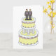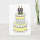 Um desenho de um casal macho em cima de um limão e de um bolo branco de duas camadas, colocado sobre um fundo branco.