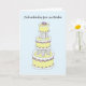 Um bolo de casamento de na moda multi-hierarquizada, colocado sobre um fundo azul pálido. As palavras Hoje e Forever são escritas em espanhol acima da imagem do bolo.