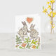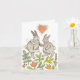 Dois coelhos pulam em parabéns alegres para o receptor do cartão. O trabalho artístico original foi feito à mão por Sue Clancy usando tinta e guache.