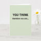 Celebre uma grande conquista profissional do seu colega, amigo, ou amado com este cartão! A mensagem é uma peça do filósofo René Descartes, com a frase "Je pense, donc je suis [Eu acho, logo existo]" ("cogito ergo sum"). A frente da placa diz: "VOCÊ PENSA", seguido de "logo você é..." Ao abrir o cartão, o texto continua: "UM PROFESSOR DE CHEIO! Parabéns!" A frente da placa está verde-claro e a mensagem aparece em impressão preto. Perfeito para o avanço do professor cheio em qualquer área acadêmica ou disciplina.