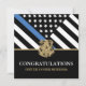 Este design apresenta uma bandeira da polícia com listras pretas e brancas, e uma fina faixa azul de linha também. Um excelente de dizer parabéns ao novo formando da academia de polícia. Personalize com o nome do polícia graduado em ouro. Celebre este marco em estilo!