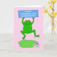 Um sapo de desenho gigante saltando sobre uma folha de lírio muito grande e uma flor branca, contra um fundo rosa pastel. O sapo tem um sinal retangular azul que diz Feliz 29 de fevereiro de aniversário'.