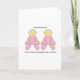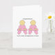 Garotas gêmeas em roupas cor-de-rosa combinando e as palavras "Parabéns em se tornar Excelentes Avós a gêmeos".