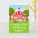 Este cartão de aniversário bonito e divertido pode ser personalizado com um nome ou título como filho, neto, sobrinho, amigo, etc. Ele apresenta um cabeleireiro vermelho com pele escura ao lado de um celeiro vermelho com um furacão de galo. Há animais de fazenda adoráveis como uma vaca, porco e galinha. Ao fundo está um céu azul brilhante, macieiras, sol, borboletas e margaridas. O texto combina fontes em negrito e sans serif para uma aparência na moda e moderna. Isto é perfeito para uma festa de aniversário temática fazenda.