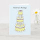 Estratificado um bolo de casamento colorido multi pastel, grupo contra um fundo azul pálido. As palavras "Heureux Mariage" (casamento feliz em francês) acompanham a imagem.