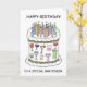 Um grande bolo de aniversário de desenhos animados decorado com velas iluminadas e imagens de diferentes coquetéis coloridos. As palavras "Parabéns a um empregado especial" acompanham a imagem.