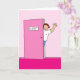 Um desenho de uma senhora saindo de uma porta que tem 'Closet' escrito nela. Ela está entrando em uma sala totalmente rosa. A sala tem uma placa dizendo "Closet".
