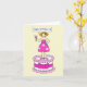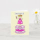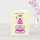 Uma moça de desenho em cima de um bolo segurando um coquetel. A senhora diz "Feliz Aniversário Liz". A imagem tem um fundo colorido de limão.