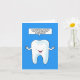 Um desenho animado de um conjunto de dentes sorridente contra um fundo azul brilhante. O dente diz "Parabéns no seu estágio dentário".