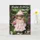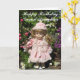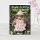 Parabéns. Texto da Grande Filha com bonequinha bonito, vestido de rosa em meio a fundo floral