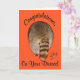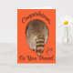 Felicito alguém que está feliz com o divórcio com um cartão humorístico que apresenta um bumbum de guaxinim com um design de flor bonito em um fundo laranja.