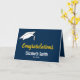 Este cartão azul e de graduação de milho tem um boné branco no canto superior esquerdo. O texto diz 'Parabéns em um script de milho. Na frente, você pode personalizar a placa com o nome do formando em texto branco. Você pode até adicionar o ano em que o estudante se gradua com o nome. Dentro na placa, há uma mensagem e um local para adicionar o nome do formando e o nome do remetente. O azul é HEX #00274C. Milho é HEX #FCB05.