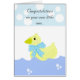 Diga parabéns no novo bebê com este doce pato amarelo com um arco azul ao redor do pescoço flutuando na água. Uma borda macia de azul com pontos brancos grandes. Personalizar conforme desejado.