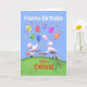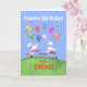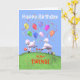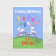 Cartão para os aniversários gêmeos com minha trabalho de arte de dois cordeiros bonitinhos brincando lá fora e celebrando seu aniversário com balões. O texto diz "Parabéns aos gêmeos!"