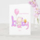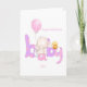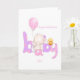 Elefante bebê menina muito fofo sentado na letra bebê com balão rosa.