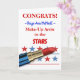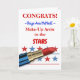 Cartão totalmente personalizável com áreas de texto na capa para adicionar seu próprio texto. Adicione um nome para um graduado recente da escola de cosmetologia. Imagem em negrito de um batom vermelho com estrelas ao fundo. Texto em negrito em vermelho e azul. Esquema de cores patrióticas em vermelho, branco e azul. Parabéns ao Maquiador das Estrelas. Arte, imagem e versos copyright © Shoaff Ballanger Studios.