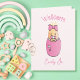 Esta placa de Chá de fraldas rosa-branca é uma manutenção única. Um doce bebê balançado está na frente com a palavra Bem-vindo. Você personaliza o nome e o dentro de mensagem.
