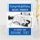 Parabéns sobre como passar no teste de condução. Foto divertida ilustrativa de um instrutor de condução ou examinador de condução nervoso. Personalize com sua escolha de nome. Placa de parabéns para um driver recém-qualificado.