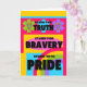 Parabéns sobre o Cartão de Saída com Stand for Truth, Stand for Bravery, Stand with Pride. Design colorida em cores brilhantes com corações, formas e grande arco-íris. Celebrar amor, aceitação e bravura. Arte, imagem e direitos de autor versos © Shoaff Ballanger Studios, 2022.