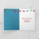 Uma caixa de presentes azul com paraquedas vermelhos e brancos desce através de um céu noturno estrelado, enquanto a lua de cheio brilha intensamente no fundo. O texto do dentro pode ser alterado.