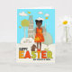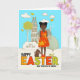 Laranja, amarela, verde e azul criam uma Páscoa tipo primavera para uma menina com uma criança americana étnica vestida no seu melhor domingo e seu coelho companheiro.