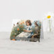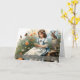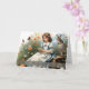 Uma jovem de vestido azul com tocas brancas senta-se num banco de madeira no meio de um jardim florescente. Ela está lendo uma pequena carta enquanto borboletas voam ao seu redor. Uma lebre e um coelho pequenos sentam ao lado dela, enquanto outras flores de primavera florescem em cores quentes no fundo. As palavras "Felz pascoa" dão à imagem um toque festivo.