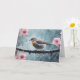 Pássaro num galho com gotas de chuva e flores cor-de-rosa para simpatia