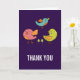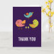 Um cartões de agradecimentos com um trio de pássaros bonitos e caprichosos desenhados à mão. 2 dos pássaros estão juntos com alguns minúsculos pinheiros verdes no meio dos pés. Outro pássaro azul está voando no ar entre eles. Colocado sobre um fundo roxo.