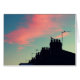 Uma foto de chaminés de telhado, e antenas com alguns pássaros silhuetadas contra um céu vivido no início do amanhecer em tons azuis verdes com nuvem rosa.