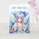 Uma fada bonito com cabelos trançados por lavanda e asas iridescentes segura uma varinha de borboleta, cercada por flores e bolhas.