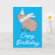 Uma carta engraçada com ilustração de uma capybara vestindo um chapéu e lenço de Festa de aniversário rosa, azul e amarelo pastel, com o trocadilho Capy Birthday abaixo. O dentro diz: "Desejando um dia especial cheio de todas as coisas que você ama. Feliz aniversário!"